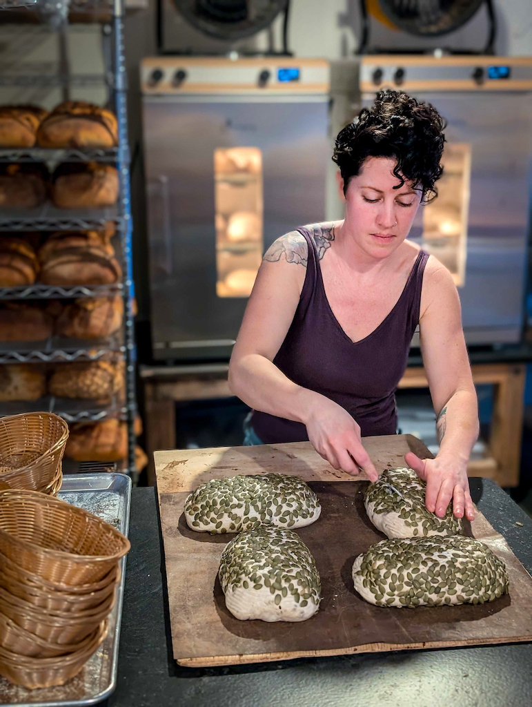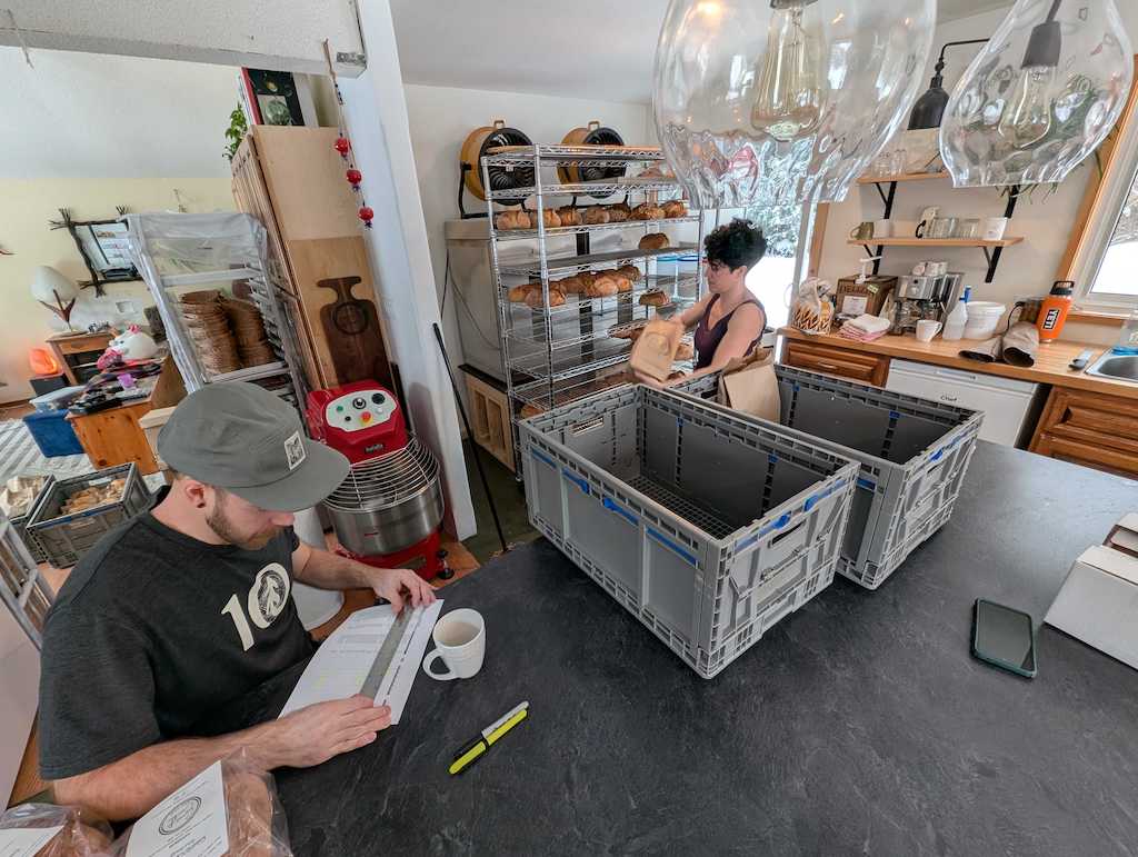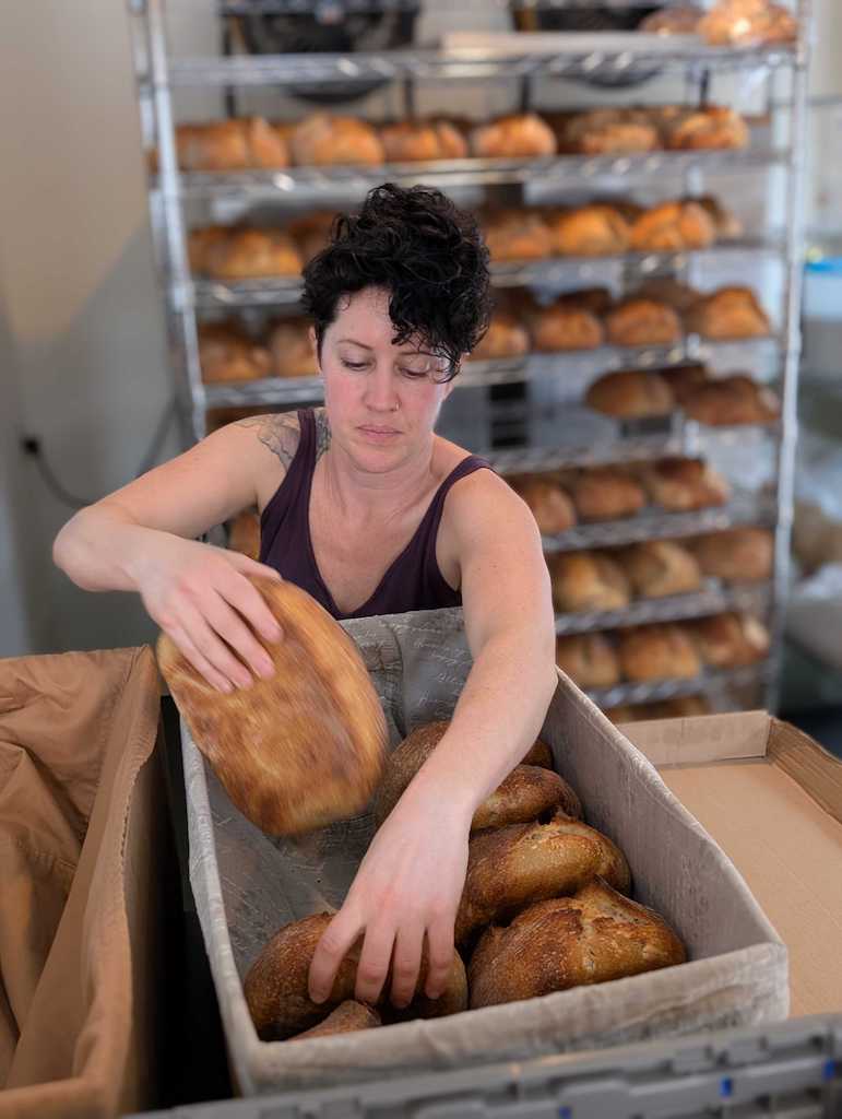 “Usually on Tuesdays I’ve got 100 or so sourdough loaves to prep. They go in the fridge overnight to cold proof, and then on Wednesday morning, it depends on how many orders rolled in but I could bake anywhere from 100 to 150 Wednesday morning. That’s from like 5 – 9 a.m., and then Matt goes out for delivery around 10. And then, while he’s out for deliveries, I begin prepping for the next day – it could be anywhere from like 100-120 loaves. By the time he gets back we have to sit down and decompress, have lunch and then around 2 p.m. we start shaping. The kids get home at 3:45 and we’re still shaping. Then we jump right into dinner. And then bing, bang, boom – the day’s done. I’m in here all day. Like, all day,” she laughs.