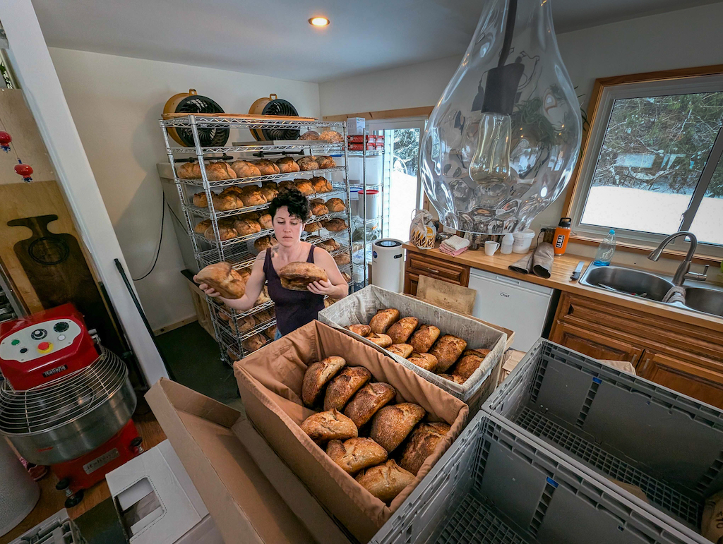 It’s a blustery, dark, cold morning in February. I’m on the backroad to Sauble Beach at 5am to bake bread with Katy and Matt from Crust & Crackle Artisan Bread. When I arrive, Matt is already snowblowing the driveway and the kitchen light is on. Katy is already hard at it, flipping loaves of bread into two ovens in their repurposed, expanded home kitchen.