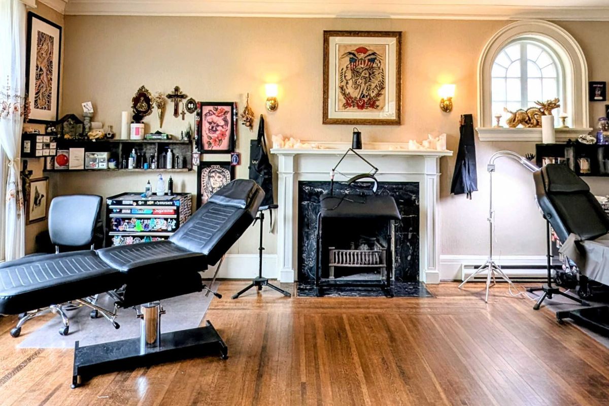 The moment you step across the threshold of the new Buried Wealth Tattoo Collective location, you feel it: a palpable shift in atmosphere. It’s not the familiar, intimidating vibe of a ‘traditional’ tattoo shop; no black walls, no barrage of skulls and skateboards, no weathered bikers hanging out in the corner, no coffee tin of cigarette butts on the front stoop. Instead, you’re enveloped in something far more inviting – dare I say regal – nestled within the bones of an old century home on Owen Sound’s 10th Street West.