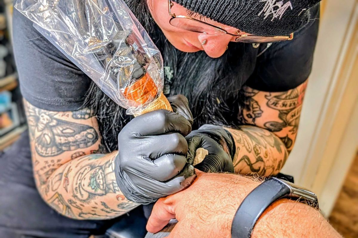 The collective’s guiding principle is simple: be approachable, warm, and anti-intimidating. As I take another look around, it’s Agella’s turn to tattoo me. The burn of the needle tickles the back of my arm, and we keep chatting.