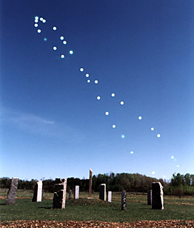 Over the years, various related projects have sprouted up near the henge, all relating to space, time or both. Steve and Bill will get together, generally over a cuppa tea, and one of them will say “You know what would be neat to do?” and they’ll be off on another ambitious project. As was the case with the analemmatic sundial to the east of the henge. The Loneys, while touring France, photographed a lovely sundial in Avignon. Upon returning, Bill showed Steve the photo and asked “Could we build something like this for the garden?” The answer was yes, and build it they did. In an analemmatic sundial, the gnomon, which casts the time-telling shadow, is not fixed, but rather must be positioned according to the date. And in this analemmatic sundial, the gnomon is you. When you visit (and you should), be sure to try it out.