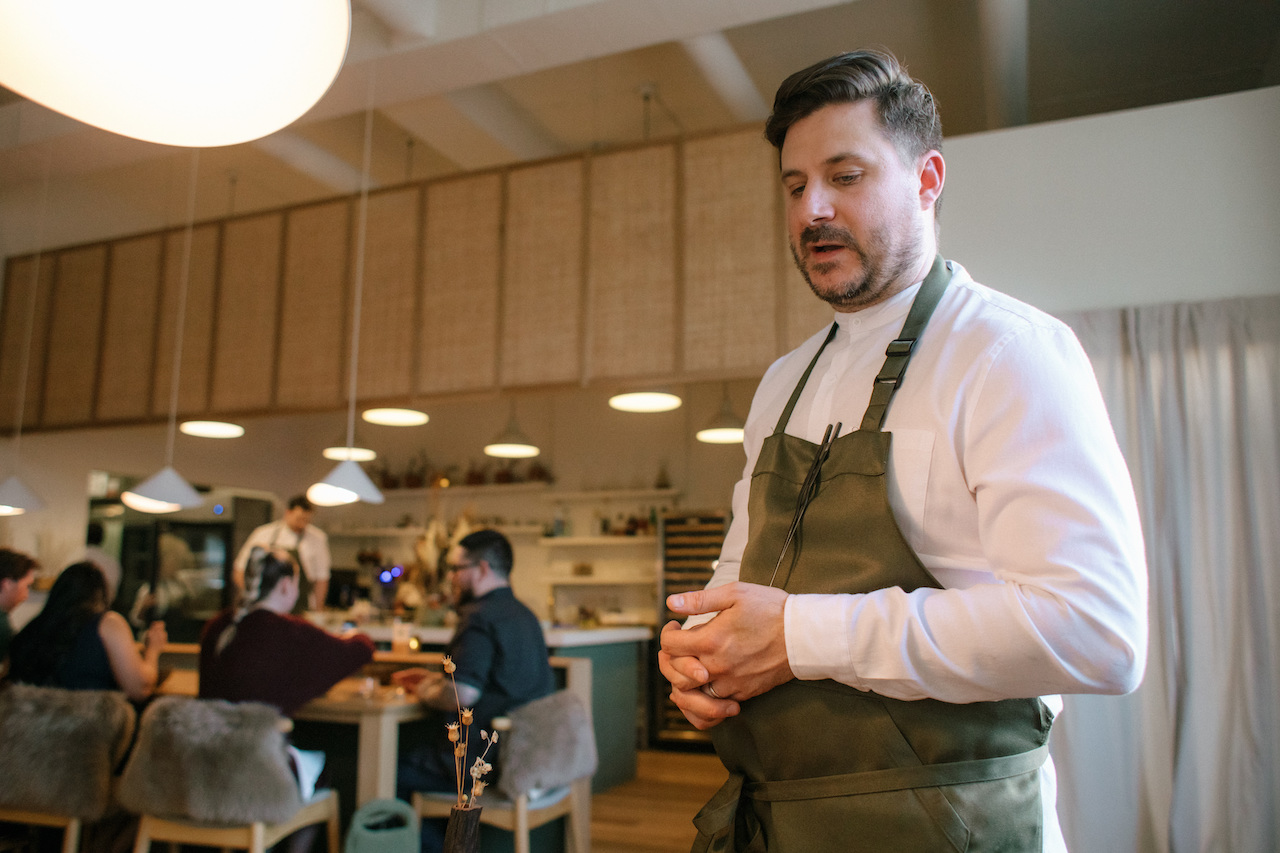 The space is minimal without feeling stark, clearly influenced by Scandinavian architectural design. Jeremiah, the general manager, stands in a tailored vest, neatly ironing crisp white linens for the evening’s dinner service. We chat, and I ask him what’s changed since receiving the Michelin star.