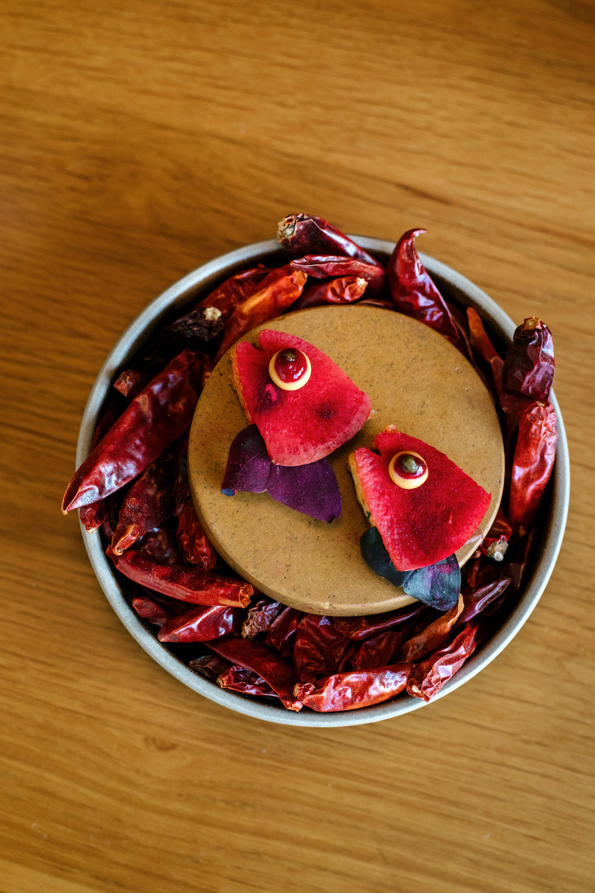 Each dish is, truly, an individual work of art – painterly and sculptural, organic and geometric. They arrive in terracotta pots, on pillows of dried chilies, clutched in the raised claws of crab figurines. Every course is an incisive expression of Jeremy’s travels through China, reinterpreted through a Central Ontario lens.