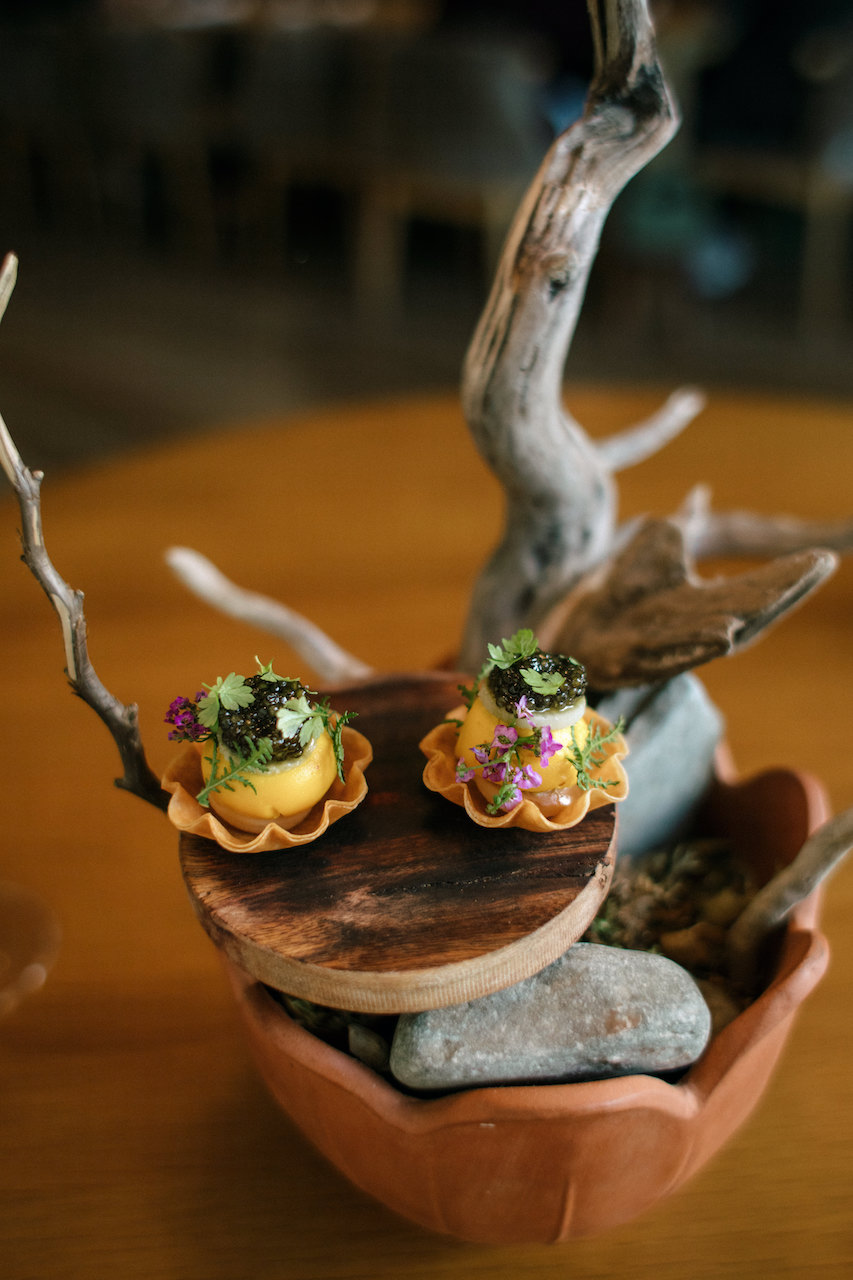 As if to make that point crystal clear, we open with a classic Chinese dish: a tea egg, soaked in black cardamom and cassia bark oolong. But slyly, Jeremy has devilled the egg with a smoked yolk filling – a nod to small-town Canadian potlucks, and a declarative mash-up of East meets West, haute cuisine meets familiar fare. A crown of golden New Brunswick sturgeon caviar and minuscule, meticulously placed edible florets signals that we should expect upcoming opulence.